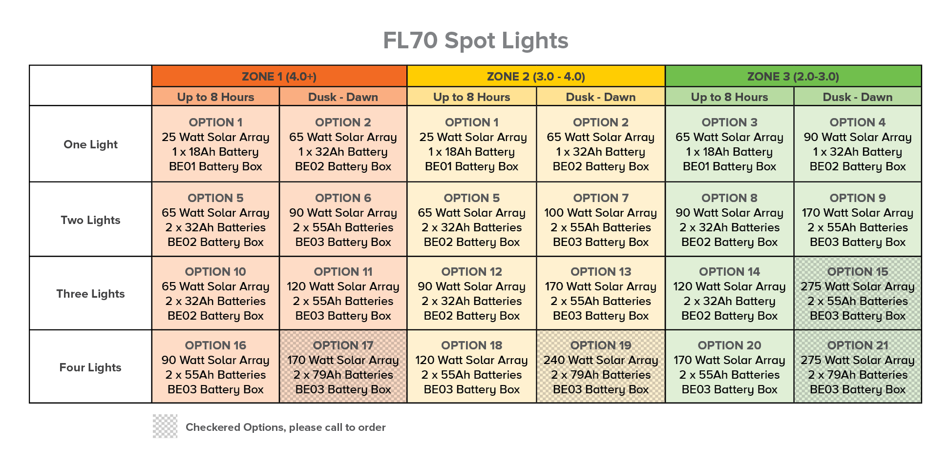 Please note that the installation location and desired light fixture power (Wattage) will determine the appropriate sized solar panel and batteries for your system. Please refer to the zone map and options table below, and select the correct system option from the drop down bar above.