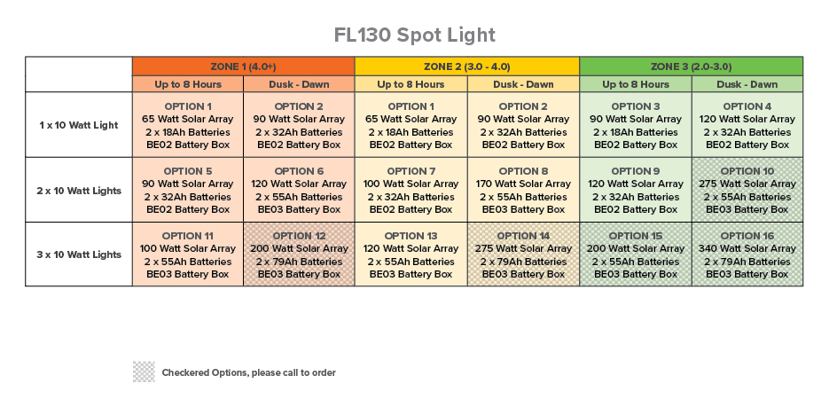 For appropriate system sizing for you location, determine the zone that your system will be installed in using the map below. Then refer to the table, select the desired illumination time in your zone, and decide on how many light fixtures needed. Determine what system option number you’ll need and make that selection in the drop down menu above.