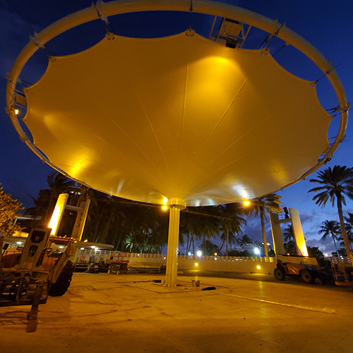North Beach Bandshell located in Miami, FL was having a new 70’ diameter pavilion built in front of its main stage. They had the design for the pavilion finalized, but did not have a source to power any lighting. We were approached to provide a solar powered lighting solution. The requirements for the project included an average of 0.5 foot-candle light intensity at the ground under the pavilion, and the lights needed to be sea turtle friendly due to the location on Miami Beach. Six lights were requested for the project with an 8 hour illumination time each night.
