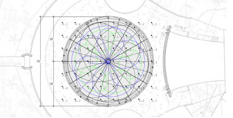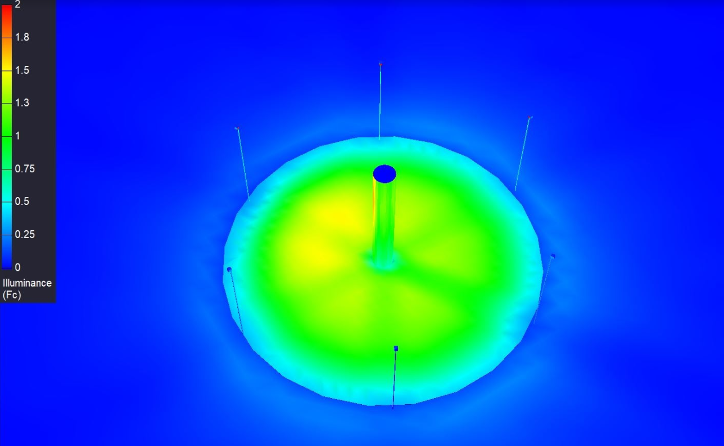 A photometric layout was created using the six sea turtle friendly lights. We achieved a 0.62 foot candle average which is above the 0.5 foot candle requirement for the project. The lights were designed to be mounted to the pavilions circular support which was elevated at 25’ above ground.