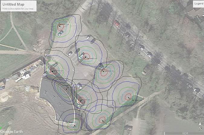 To determine the appropriate LED power and number of light poles, we generated a photometric layout for the site. While creating the layout for the solar parking lot lights, careful attention was paid to the large trees to the east of the property. In order to avoid potential shading on the solar panels, light poles were positioned within the parking lot, rather than along the eastern perimeter. Lights were also positioned to achieve the most efficient coverage, as well as keeping any light pollution to the natural areas to a minimum.