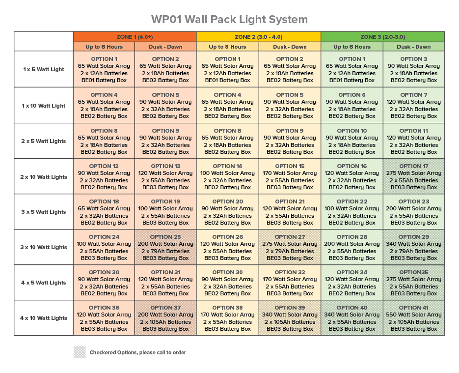 This solar system consists of one to four LED wall pack lights, offered in 5 Watts or 10 Watts. Additional lights and/or higher powered lights can be added upon request. Once installed, the light fixture allows for 90 degrees of angle adjustment, making lighting only the areas needed a possibility. Our lighting kit is supplied with all the necessary equipment including solar panel, solar rechargeable batteries, MPPT charge controller, battery enclosure, solar panel mounting triangles and necessary cables. The size of the solar panel and batteries will vary based on the installation location, desired light fixture quantity and wattage, and illumination time. Please refer to our zone map and systems option table to determine the necessary system for your location. Dusk to dawn illumination is available, up to 8 hours or any other required illumination time. Timers, motion sensors, dimming, manual on/off switches can be added upon request. Color of light fixture is bronze. Color of light output is white.